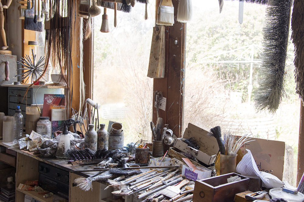 We talked in his studio, fitted with big windows for their generous natural light. John made the studio with his landlord whom he likes a lot. The door is pretty much always open to let the paint fumes out. The walls are covered in layers and layers of paint splatters, offcuts of wood lean up against the walls; tools and brushes hang from the ceiling.