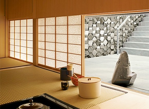 There are more than 25 objects connected to the Japanese tea ceremony. Things like tea boxes, ash and charcoal containers, carriers, brooms and spoons, incense, shelves, trays, braziers, teapots, tea scoops, bamboo whisks, copper bowls, tripods, woven mats, iron pots and water ladles and containers. A ‘Ro’ is a fire pit – another common piece of tea ceremony equipment. Pictured here in a house designed by Tadao Ando.